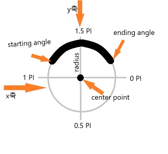 //(x,y,radius,startAngle,endAngle,counterclockwise) x-호 중심부의 수평좌표 y-호 중심부의 수직좌표 radius - 반지름 startAngle,endangle -호의 시작점과 끝 점 counterclockwise- 시작점끝점의반대방향 (기본값:false) 0PI와 2PI사이 시 작점끝점나타낸다